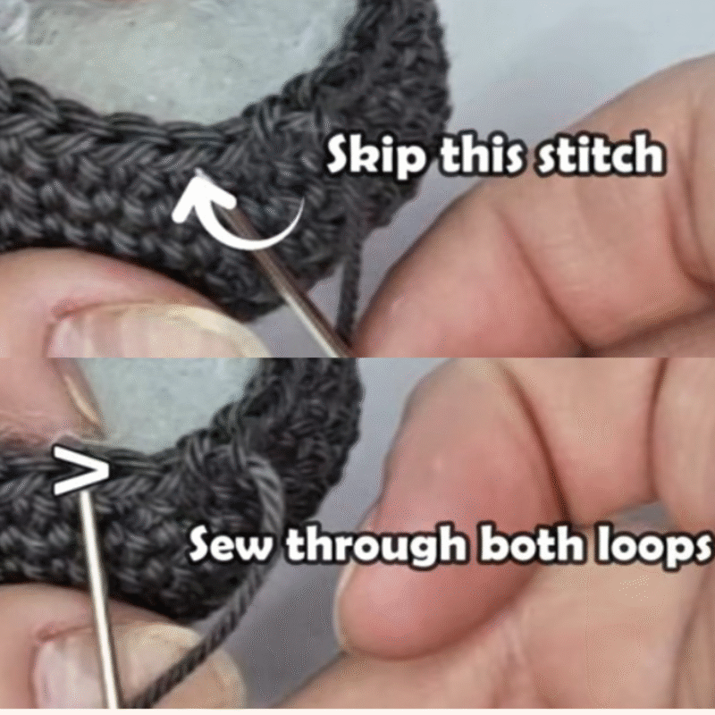 this video Toyuril I’ll be showing you how to do an invisible color change when working in the round we’re going to begin by making an invisible stitch so work the last Stitch according to the pattern and pull up a loop about 3 to 4 in is fine and now cut the yarn and pull the working yarn out like so now using a darning needle we’re going to skip this next Stitch and so through both Loops of this next Stitch from the front to the back and now skip this Stitch