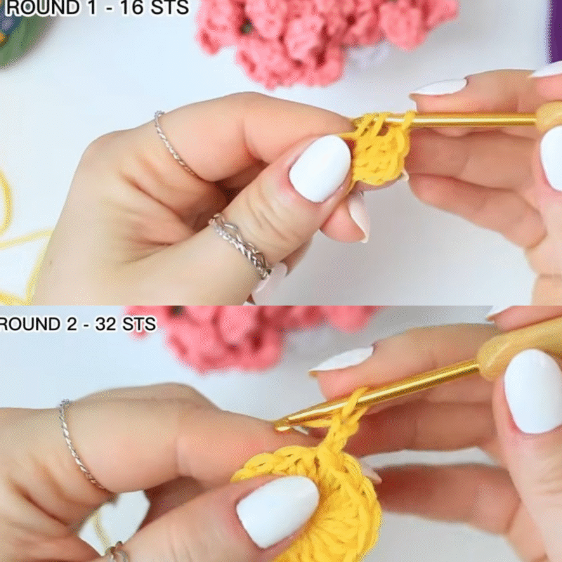 - two double crochets into the same Stitch and then follow that same step all the way around creating double crochet increases into every Stitch around and for the second round you should have 32 stitches so once you have the 32 stitches around slip stitch into the very first double crochet chain two work an increase into that very first Stitch where you did the zp Stitch so two double crochets into the same Stitch and then one double crochet into the following Stitch an increase into the following Stitch so