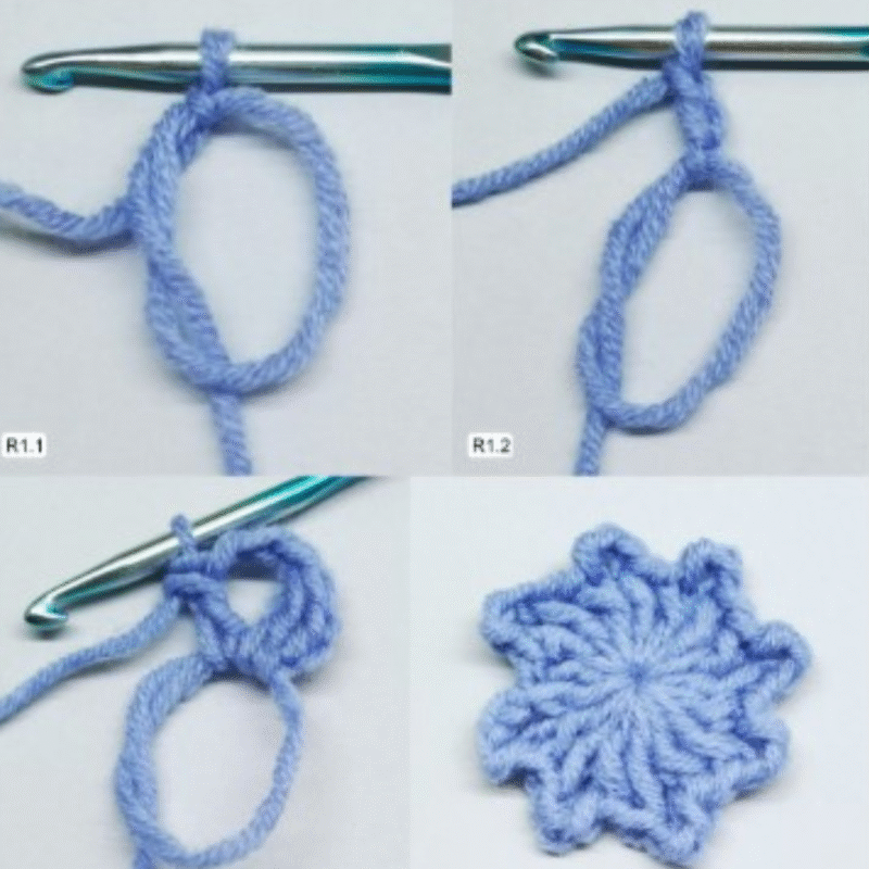 - Round 1. Magic ring (R1.1), ch2 (R1.1), dc, ch3, dc into ring (R1.3)*, repeat 8 times.