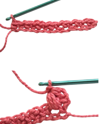 In the fourth chain from the hook, work a puff st. *Skip 1, puff st 1; Repeat from * to end. Turn.