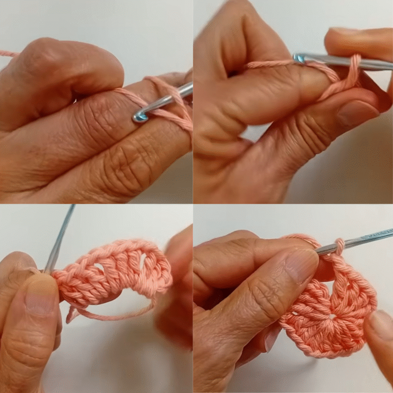 In the second row, the instructor demonstrates forming “shells” (lequinhos) by crocheting two groups of three double crochets separated by a chain stitch in each chain space from the previous row. This increases the number of blocks from five to ten around the circle, effectively expanding the cap’s diameter.