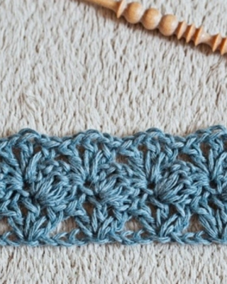 Row 3: ch4, dc in base of ch4, skip ch-3 sp, shell in next sc, repeat from * to last ch-3 sp, skip ch3-sp, (dc, ch1,