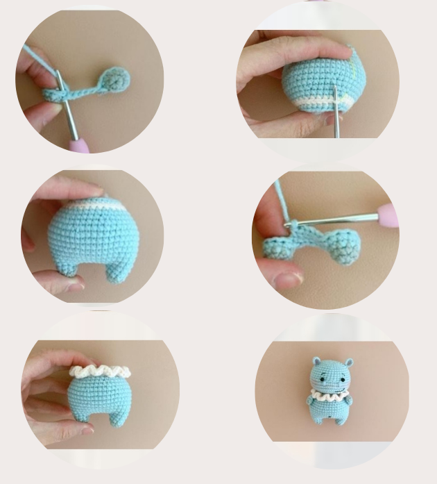 1. Mr, 6sc [ 6 ] Change the yarn to light blue 2. ( 2sc, inc )*2 [ 8 ] 3. 8sc [ 8 ] 4. ( 3sc, inc )*2 [ 10 ]