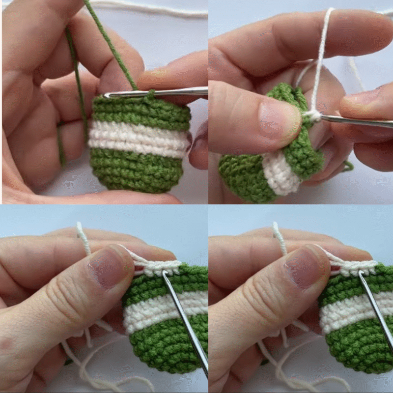 to day I’m going to share vedio tutorial a crochet tip on how to change Yar color smoothly between rounds here is the sample using the typical color change method withe vedio tutorial notice the transition between the two colors is uneven and the age where the colors meet is Jagged take a look at this other sample the transition between the green and white is seamless and smooth the fabric break is a much nicer appearance let me show you how to make this effect I’ve just finished crocheting the green round and the next round will be